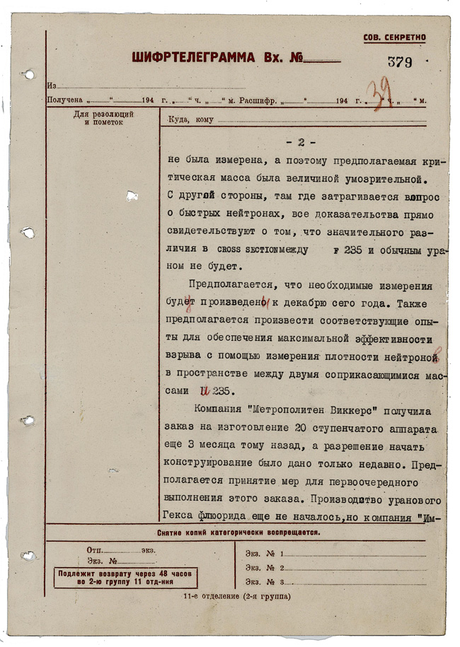 Об эффективности работы советской разведки говорит тот факт, что уже через 12 дней после окончания сборки первой атомной бомбы в США описание её устройства было получено в Москве. В 1945 году пришли подробнейшие документы о характеристиках испытательного взрыва, о методах постановки атомной бомбы на боевой взвод, а также доклад об электромагнитном методе разделения изотопов урана.