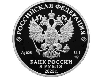 Серебряная монета номиналом 3 рубля (масса драгоценного металла в чистоте — 31,1 г, проба сплава — 925) имеет форму круга диаметром 39,0 мм.
